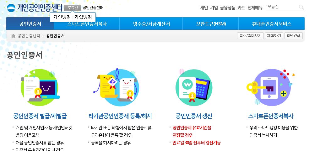 공인인증센터에 접속을 하시면 인증서를 새로 발급을 받거나 갱신 그리고 타행의 인증서를 등록할 수 있습니다.