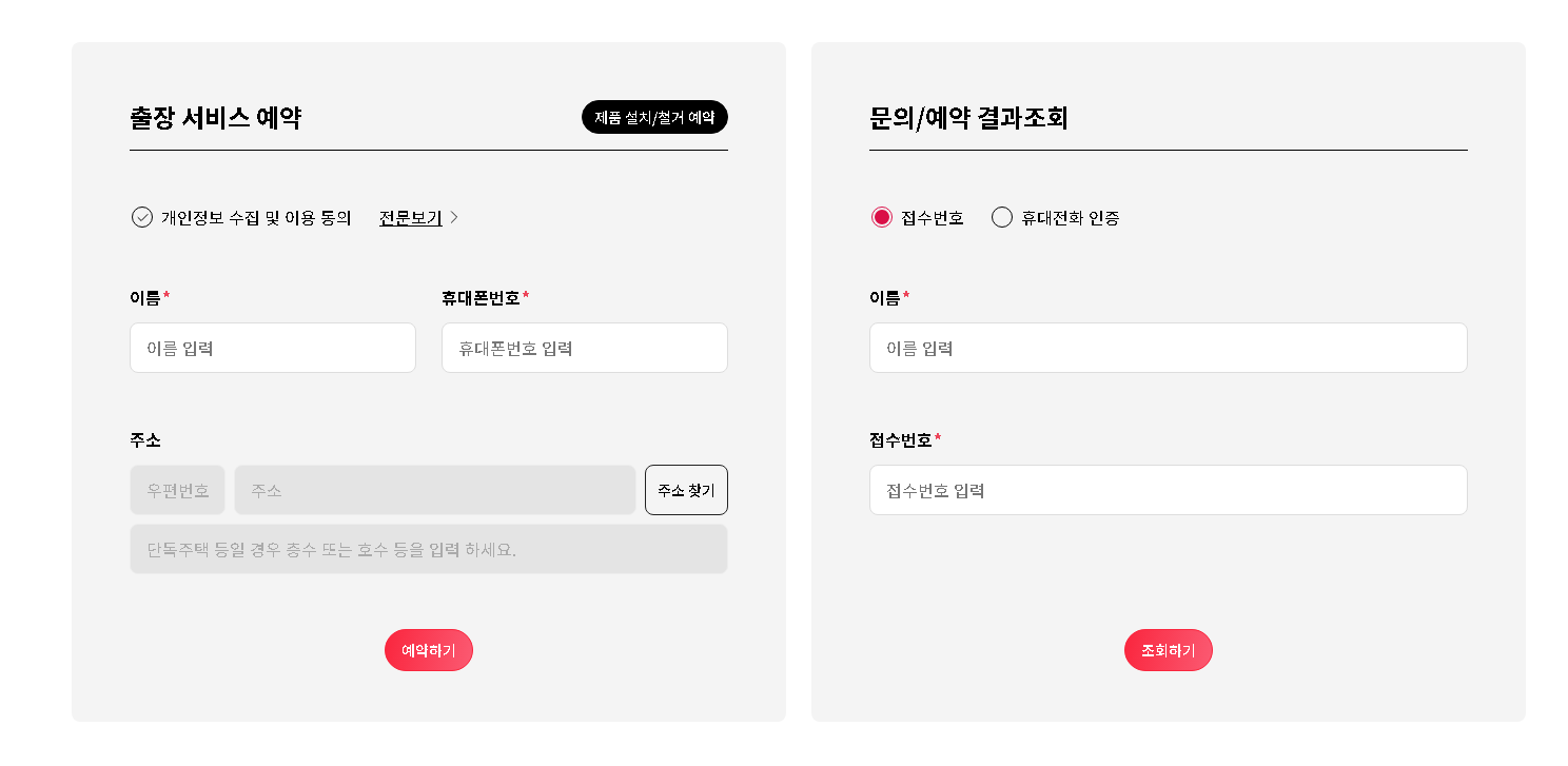 제품에 이상이 생겼을 경우에는 미리 출장 서비스를 예약해야 하기 때문에 온라인을 잘 이용하여 쉽고 빠르게 해결해보세요.